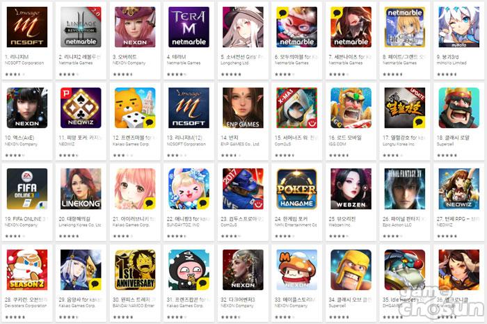 ▲ 2018년 1월 8일 오전 구글플레이 게임 부문 최고 매출 순위 갈무리