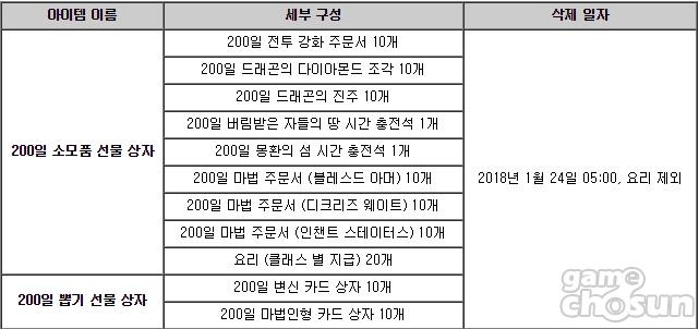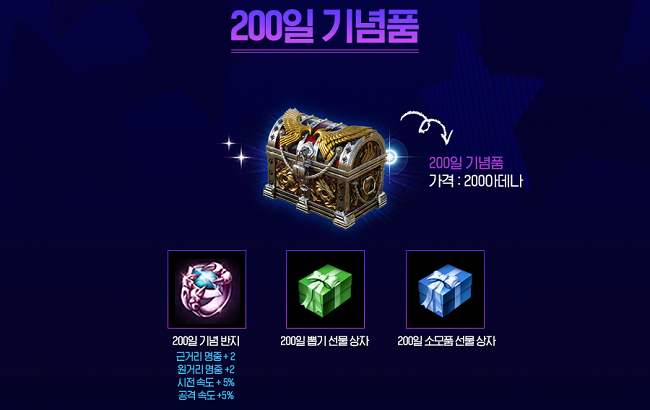 상점에서는 24일까지 200 아데나에 '200일 기념품'을 구입 가능한데, 해당 아이템을 개봉하면 200일 소모품 선물 상자와 뽑기 선물 상자, 기념 반지 3종이 확정 지급된다. 특히 200일 뽑기 선물 상자는 변신 및 마법 인형을 각 10개씩 즉시 개봉할 수 있으며 기념 반지는 근거리 및 원거리 명중 +2, 시전 및 공격 속도 +5%의 성능을 지녔다. 소모품 선물 상자와 뽑기 선물 상자에서 얻을 수 있는 아이템 목록은 다음과 같다.