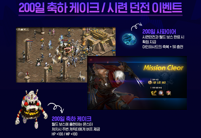이벤트 기간(10일부터 24일까지) 동안에는 월드 보스에서도 혜택이 주어진다. 200일 축하 케이크가 몬스터로 등장해, 처치 시 '어드밴스 스피릿' 마법과 동일한 효과를 부여하며 월드보스 처치에 기여할 경우에는 아인하사드의 축복 +50의 효과가 있는 '200일 사파이어'를 지급한다. 또, 시련 던전 클리어 시에도 200일 사파이어가 주어지므로 필히 진행하는 것이 좋다.