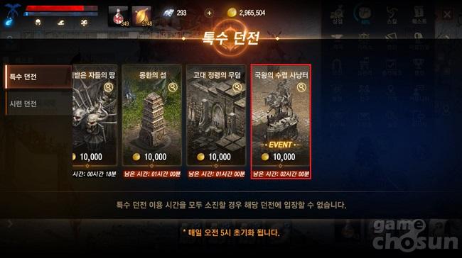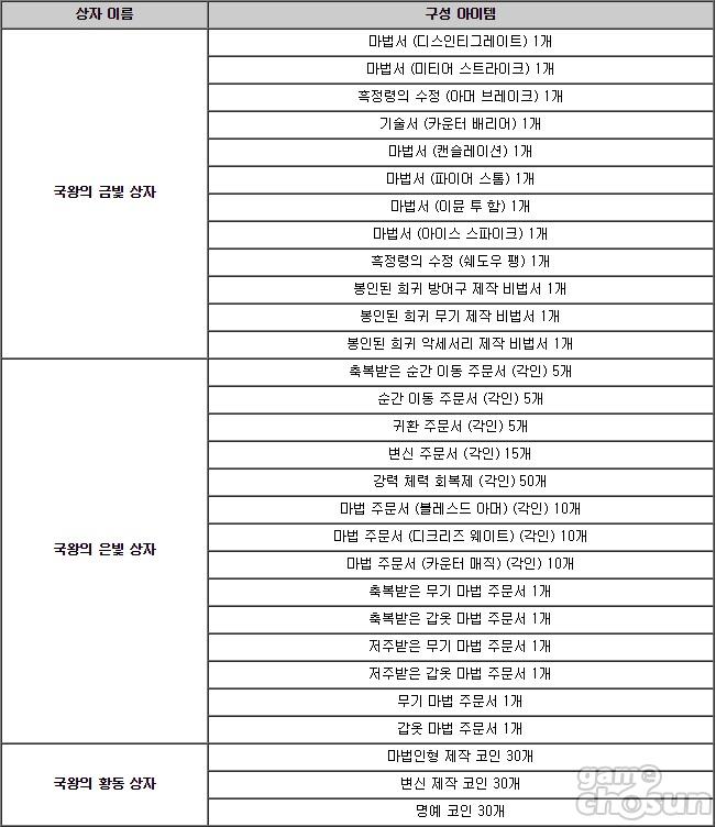 국왕의 수렵 사냥터는 10일부터 24일까지 2주 간 이용할 수 있는 기간 한정 던전으로, 몬스터 처치 시 획득 가능한 상자에서 각 클래스 별 종결 마법부터 강화 주문서, 코인 등을 얻을 수 있다.
