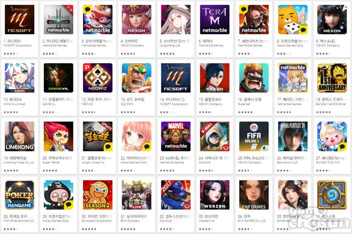▲ 2018년 1월 15일 오전 구글플레이 게임 부문 최고 매출 순위 갈무리