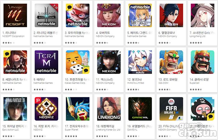 ▲ 2018년 1월 21일 국내 구글플레이 게임부문 최고매출 순위 갈무리