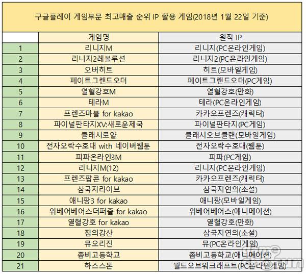 현재 국내 구글플레이 게임부문 최고매출 36위 안을 살펴보면 21종(58.3%)의 게임들이 만화, 웹툰, PC온라인게임, 모바일게임, 소설 등의 지식재산권을 바탕으로 만들어졌다.