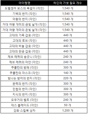 ◆ 하딘의 가넷 상자 신규 제작 장비 목록