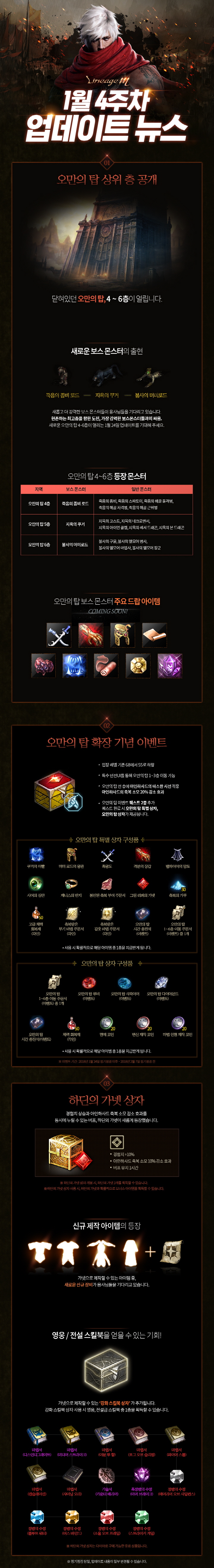 뿐만 아니라 오만의 탑 확장 기념 이벤트를 통해 특별한 득템의 기회를 제공한다. 이벤트 기간 동안 오만의탑 입장레벨을 기존 60레벨에서 55레벨로 하향하고, 이동 주문서를 소모하거나 대량의 아데나를 지불해야만 입장할 수 있었던 오만의탑 1~3층을 특수 던전 UI 를 통해 간편하게 이동할 수 있도록 변경한다. 1~3층의 전체적인 난이도도 하향 조정되고, 획득 경험치는 상향된다.