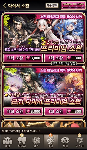 프리미엄 소환 이벤트는 3성에서 5성 다이서가 무작위로 등장하는 프리미엄 소환의 마일리지 획득량이 증가하는 내용을 담고 있다. 획득한 마일리지는 일정 수준 이상 모이면 4성 또는 5성 다이서를 확정으로 획득할 수 있으며 요일별로 프리미엄 소환 확률 증가 이벤트도 진행 중이기 때문에 만약 높은 등급의 다이서를 뽑고자 한다면 이번 이벤트 기간을 노리는 게 좋다.
