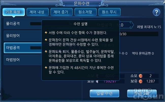 문파에 가입하고 48시간이 지나면 해당 문파의 서원 성장 수준과 문파장이 설정한 우선 수련 항목에 따라 문파원이 수련할 수 있다. 문파 수련은 물리 공격, 마법 공격으로 대표되는 '기초 속성' 뿐 아니라 '제어 내성', '제어 증가', '원소 저항', '원소 무시' 등 캐릭터 능력치를 직접적으로 상승시킬 수 있다.