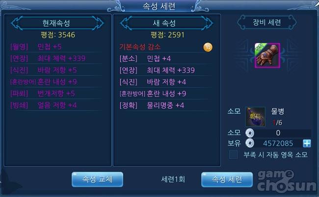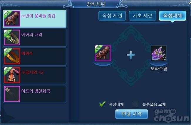 기본적으로 속성 대체 시 이전 속성을 복구할 수는 없지만, 지존 등급 장비에 한해서 속성 대체를 100회 대체했을 때, 초기 상태로 복구할 수 있다.