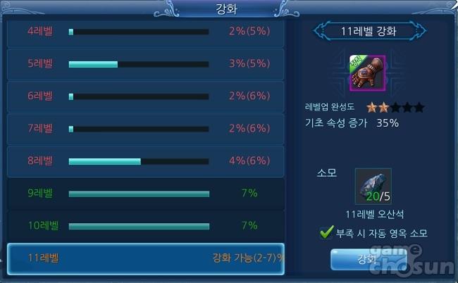 해당 레벨대의 완성도를 100% (별 5개)까지 모두 채우면 +1, +2 형태로 강화 단계가 상승하고, 착용 중인 장비의 강화 단계를 맞춰나갈 때마다 강화 효과를 추가로 얻을 수 있다. 또한, 오산석은 하위 레벨 오산석 2개로 상위 레벨 오산석으로 합성할 수 있다.