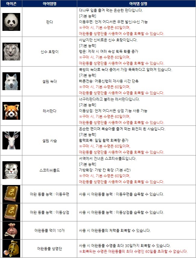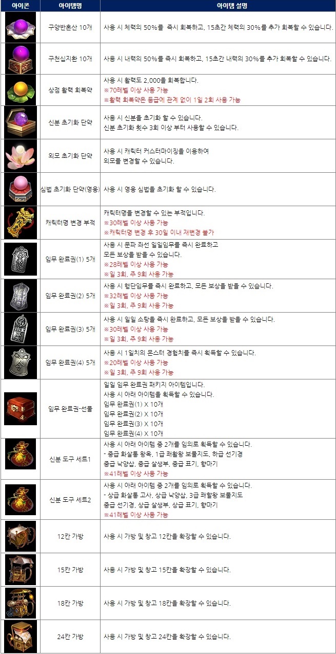 편의 아이템은 애완 동물에게 우편 및 상점을 언제어디서든 이용가능 하도록 하는 스킬과 애완동물 먹이, 생명단이 있다. 그 외에도 캐릭터의 체력 및 내력, 활력을 다량 회복시켜주는 아이템과 외모 및 심법 초기화, 캐릭터명 변경, 임무 완료권, 신분 도구 세트, 가방 등이 존재한다.