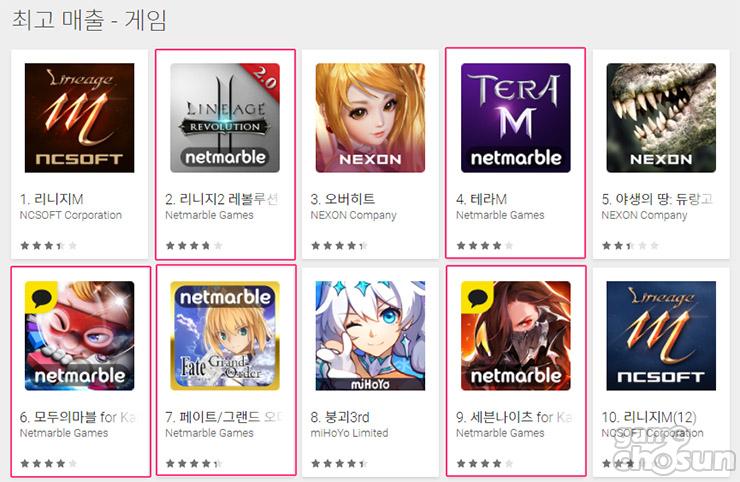 3일 구글플레이 게임 부문 최고 매출 순위에 따르면 리니지2 레볼루션이 2위를 차지하고 테라M은 4위, 모두의마블은 6위, 페이트/그랜드오더가 7위, 세븐나이츠가 9위에 오르며 탑10내 5종 즉 50%의 점유율을 확보했다.