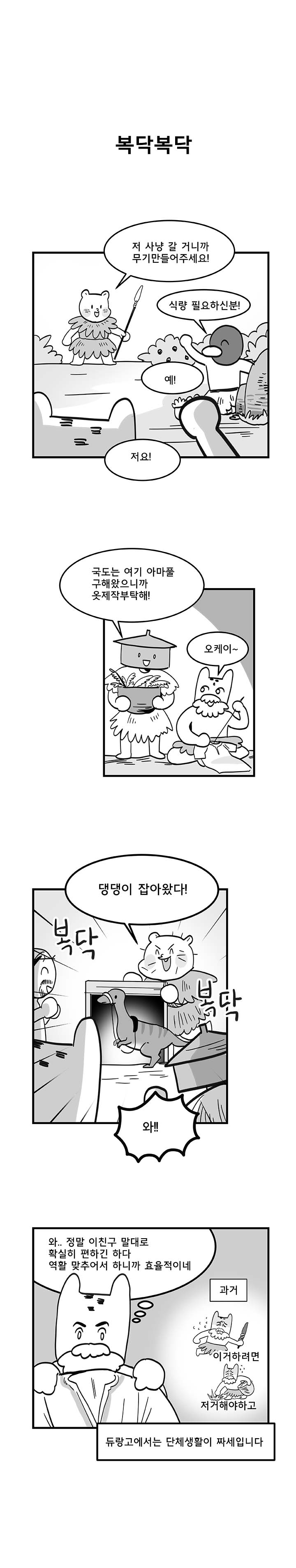 최근 웹툰 작가 국도의 '듀랑고에서 살아남기 3화 - 혼자서 힘들다면 함께'가 공개돼 이를 소개한다. 해당 작품에서는 주인공이 부족에 가입함에 따라, 부족 내에서 부여된 역할을 수행하고 소통하는 이야기가 담겨져 있다.