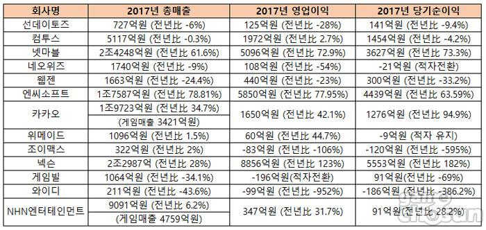 △ 2017년 게임업계 주요 상장사 실적 (출처 - 게임조선DB)