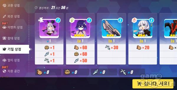기밀 상점에서는 '영원한 추억' 플레이 또는 기록 저장실을 통해 획득한 재화로 각종 아이템을 구매할 수 있다. 재료와 조각을 제외한 성흔, 무기는 모두 구매횟수가 1로 제한되며 주요 품목으로는 발키리·서약 조각, 제레·발레리(하), 테레사·기원(상)이 있다.