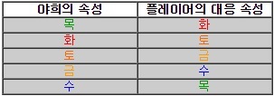 야희의 속성 대응은 동양의 '음양오행' 중, 오행에 해당한다. 목생화, 화생토, 토생금, 금생수, 수생목으로 각 속성의 상성을 따라야 한다. 나무(목)으로부터 살아남으려면 불(화), 불(화)에 이기려면 흙(토), 흙(토)에 이기려면 쇠(금) 식이다. 다시 말해서 야희가 목 속성을 띄면 화 속성 발판을 밟고, 야희가 목 속성으로 바꾸면 플레이어는 화 속성 발판을 밟아야 하는 것. 자세한 상성은 아래 표를 참고하면 된다.