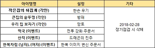 또한, 2000 다이아로 구매 가능한 신규 상품, '나르엔의 설날 패키지'도 선보인다. 나르엔의 설날 패키지는 '나르엔의 희귀 제작 비법서 패키지', '나르엔의 무기 상자 패키지', '나르엔의 방어구 상자 패키지' 3종으로, 각각 희귀 제작 비법서와 드래곤의 다이아몬드 100개, 고급~전설 등급 무기 상자와 축데이/저주데이, 고급~전설 등급 방어구 상자와 축젤/저주젤로 구성되어 있다. 해당 상품은 계정당 1회만 구매할 수 있다.