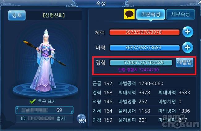 - 획득 경험치를 스킬 레벨업에 사용할 수 있음 (수행치 69까지만 가능)