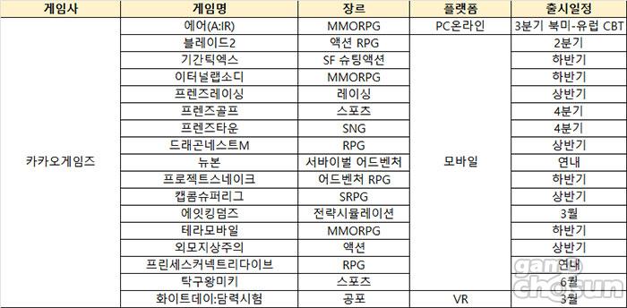 △ 카카오게임즈 2018년 신작 라인업 (출처 - 게임조선 정리)