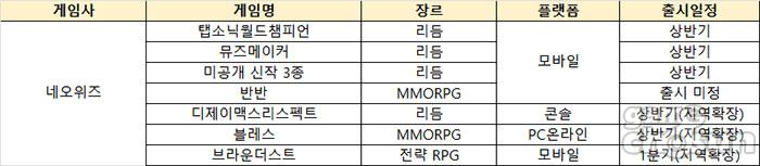 △ 네오위즈 2018년 신작 라인업 (출처 - 게임조선 정리)