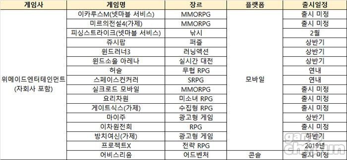 △ 위메이드 2018년 신작 라인업 (출처 - 게임조선 정리)