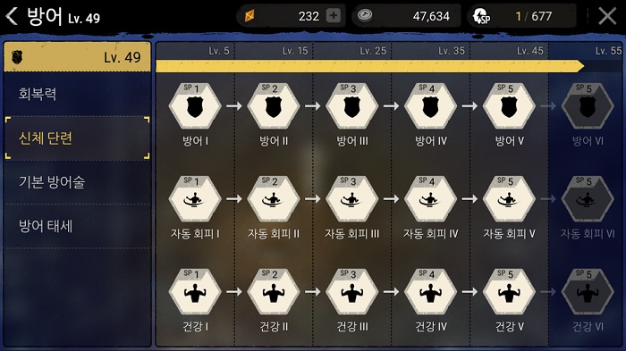 방어 스킬은 안타깝게도 단순히 맞는다고 방어 경험치를 획득할 수 없다. 방어 행동을 해야만 경험치를 올릴 수 있다. 방어 행동에는 구르기나 막기 등의 행동이 있는데, 이를 성공시켜야만 경험치를 획득할 수 있다. 다만, 구르기에는 쿨타임이 있는데다 무기에 따라 막기 불가 무기도 있는 만큼 방어 레벨이 생각만큼 오르지 않는다.
