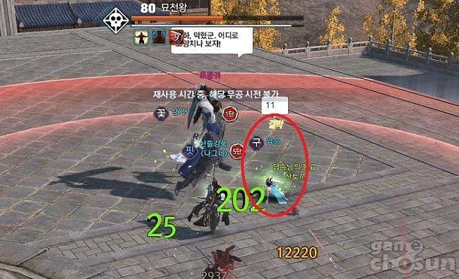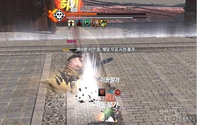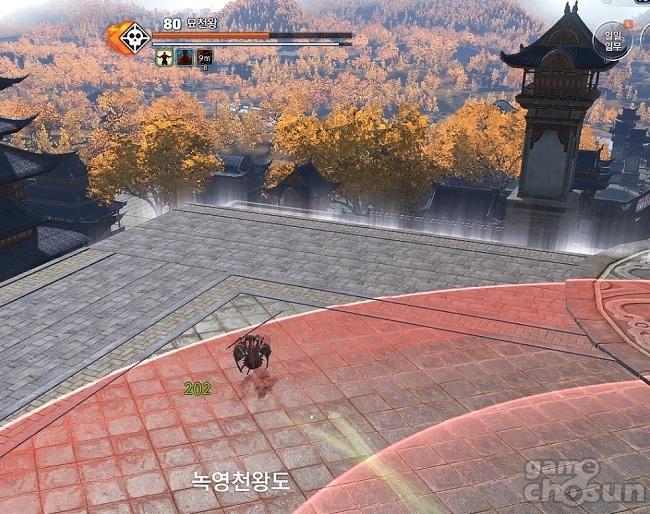 따라서 분노게이지가 거의 가득 찼을 때 묘천왕의 머리 위에 표시가 붉은색이라면 공격을 중지하고 초록색으로 바뀔 때까지 기다려야만 한다. 그리고 초록색일 때 묘천왕의 분노게이지를 가득 채워서 게이지가 활성화된 상태(불타오르는 이펙트를 확인하자)가 되면 즉시 중앙에서 외곽으로 이동해야 한다. 이 때 광역기를 느긋하게 피하면 점프를 할 수 없도록 하는 공격을 하니, 광역기 확인 즉시 2단 이상 점프하거나 외곽으로 빠져서 점프를 막는 공격에 피격당하지 않아야 한다.