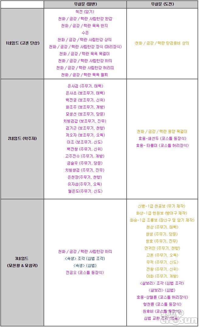 물론 레이드 던전 창오성에 입성해보기 위해서는 무살문 던전 이전의 '용수산', '군왕부', '혈무루' 등의 도전 난이도를 클리어해 65레벨 전설 장비를 모두 갖춰야하는 것이 일반적이다. 만약 이전 던전의 장비를 착용하지 않았다면 파티에 속하기 힘들 수도 있다.