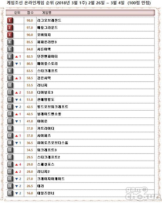 ▲2018년 3월 1주 온라인게임순위 (게임조선 제작)