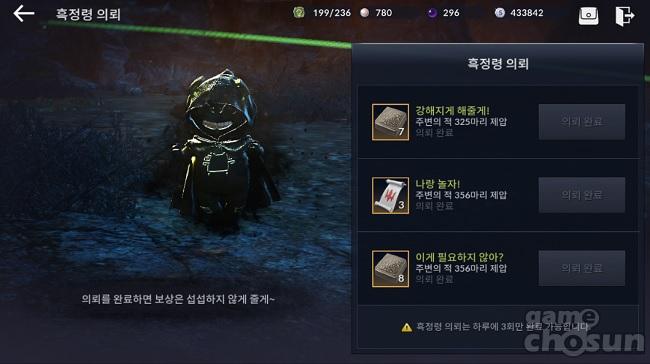 검은사막모바일을 플레이하면서 일일과제만 수행한다면 뭔가 아쉽다. 그리고 사실 일일과제 보상은 자잘하다고 느낄 수도 있겠다. 이에 반해 하루 3회 수행 가능한 '흑정령 의뢰'의 보상은 화끈하다. 흑정령 의뢰는 단순히 몬스터를 다수 클리어하면 완료할 수 있는데, 이를 통해서 '고대의 석판'과 '토벌 추천서'를 획득 가능하기 때문.