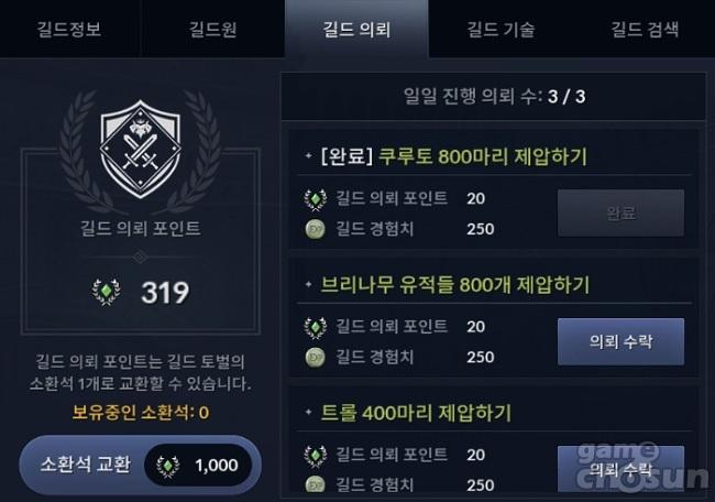 만약 길드에 소속돼 있다면 '길드 의뢰'도 3회 수행하는 것을 추천한다. 길드 의뢰의 경우는 같은 길드 내 유저가 부지런히 수행함으로써 길드를 성장시킬 수 있다. 길드가 성장할 경우에 길드 기술에 투자해 부가적인 능력치 상승이 가능함과 동시에 길드 의뢰 포인트를 모아서 '길드 토벌의 소환석'으로 교환할 수 있다.