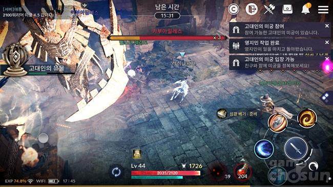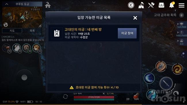 고대인의 미궁은 총 6개의 난이도로 구성돼 있으며 권장 전투력이 표시되므로 이에 맞춰 입장하면 된다. 약 45레벨 정도에 1600 이상의 전투력을 가졌다면 네 번째 난이도에 입장하는 편이다.