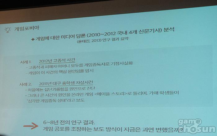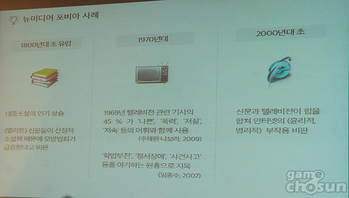 이런 2가지 공포의 결합으로 게임을 공포의 대상으로 만든 사례를 지난 2010년부터 2012년 미디어에서 다룬 기사로 들었다. 2011년 발생한 대구 중학생 자살사건은 가해 학생들을 게임중독 상태로 보도했지만 가해 학생들이 게임을 피해 학생에게 시킨 것으로 연관성이 없다는 것이 발제에서 지적됐다.