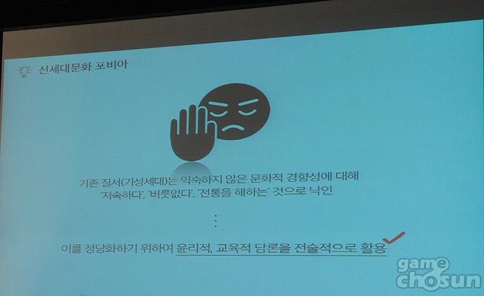 윤태진 교수는 “게임포비아가 어떻게 됐을까 생각해보면 최근의 셧다운제를 들 수 있으며, 지금은 질병 분류화라는 새로운 공포가 등장하게 됐다.라고 언급했다.