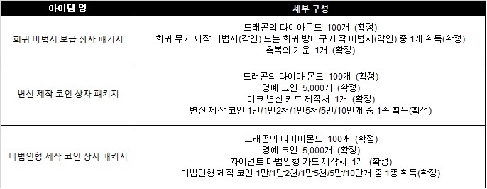 이번에 추가된 보급 상자 패키지는 각각 '희귀 비법서 보급 상자 패키지', '변신 제작 코인 상자 패키지', '마법 인형 제작 코인 상자 패키지' 3종으로 각각 2,000 다이아씩 별도의 구매 제한이 있으며, 이름대로 희귀 비법서 확정 보상, 변신 제작 코인 랜덤 수량 보상, 마법인형 제작 코인 랜덤 수량 보상을 얻을 수 있다.