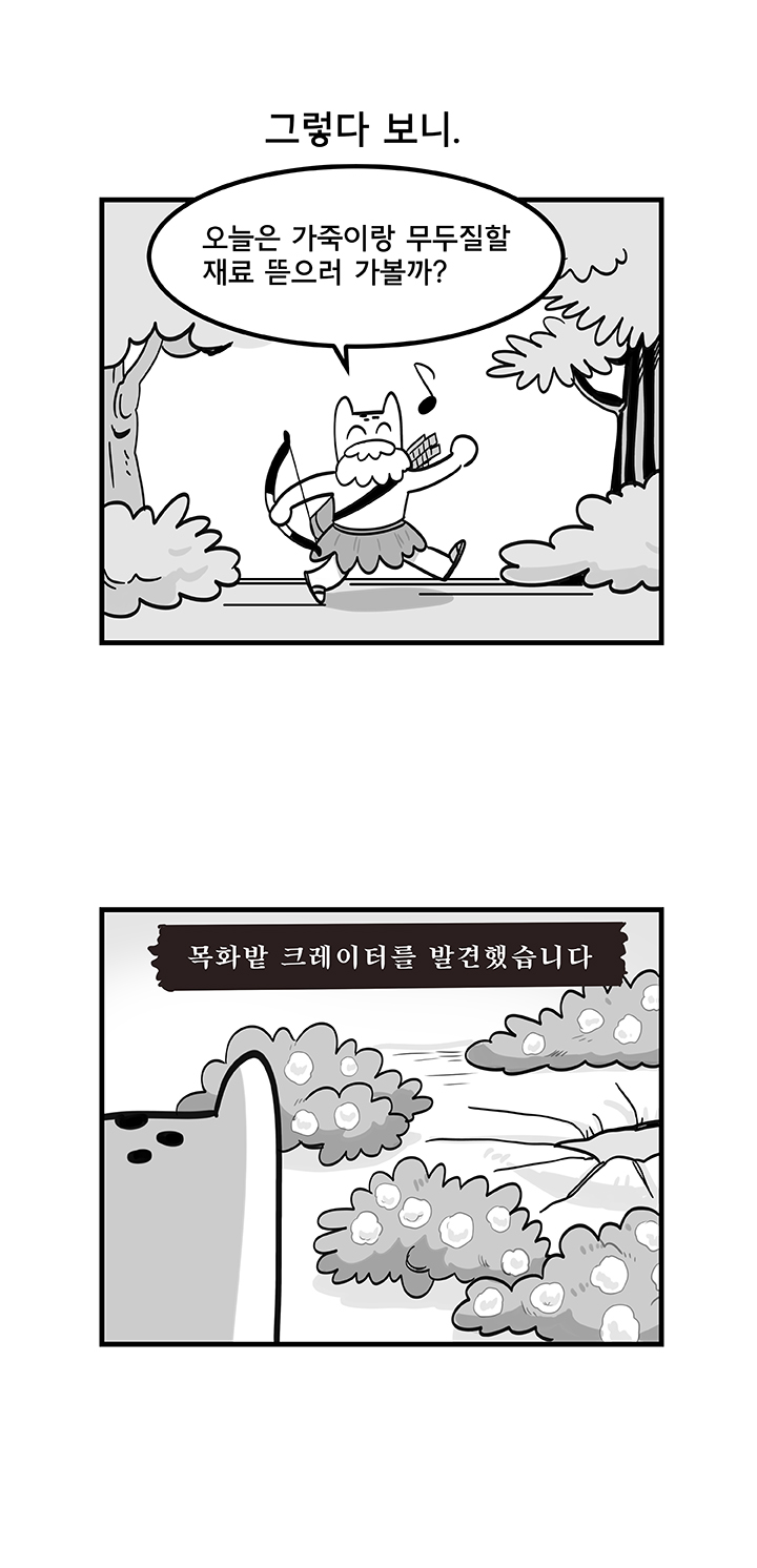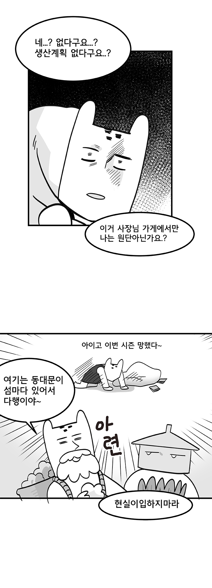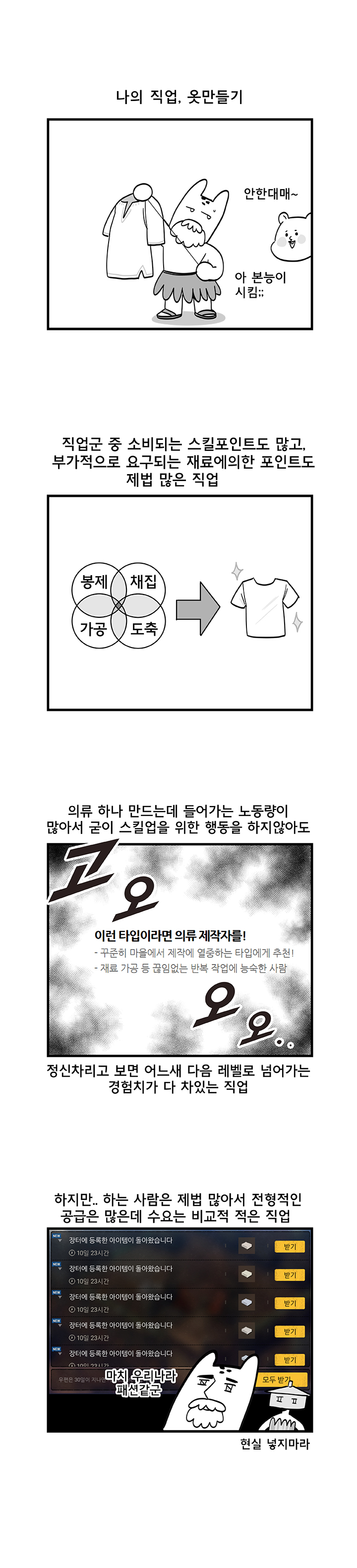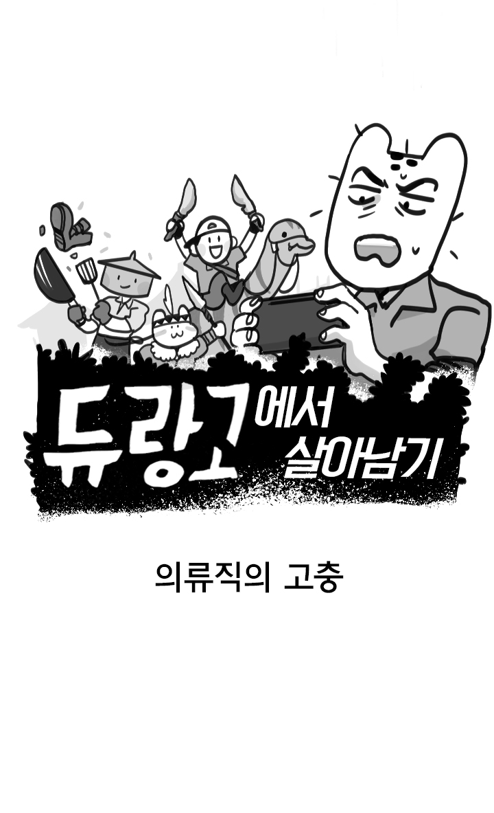 아래는 웹툰 작가 '국도'의 '듀랑고에서 살아남기 5화 - 의류직의 고충' 작품이다.