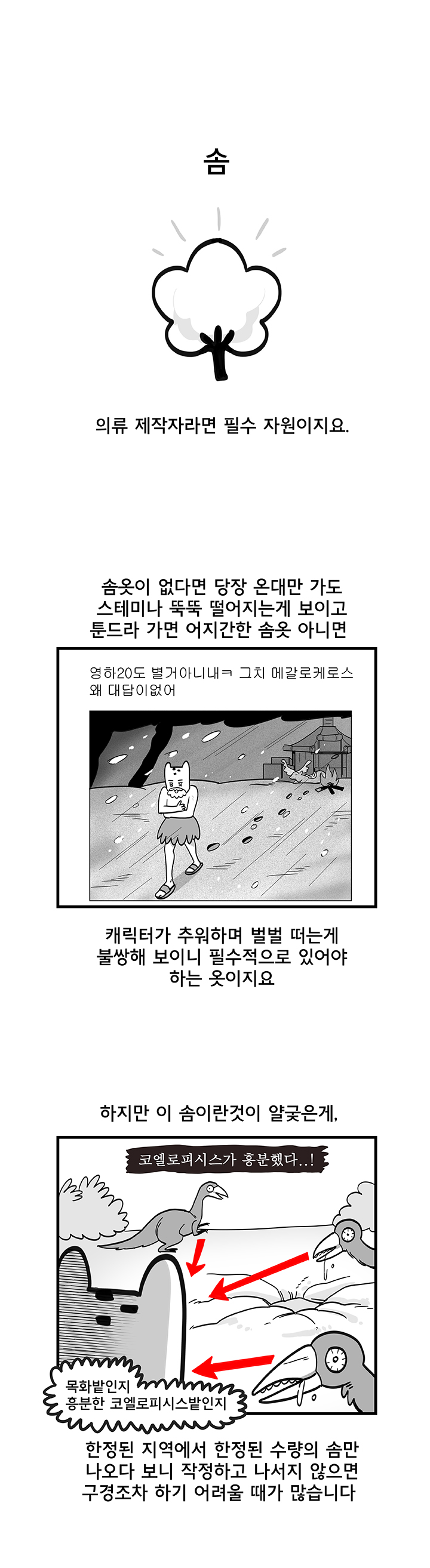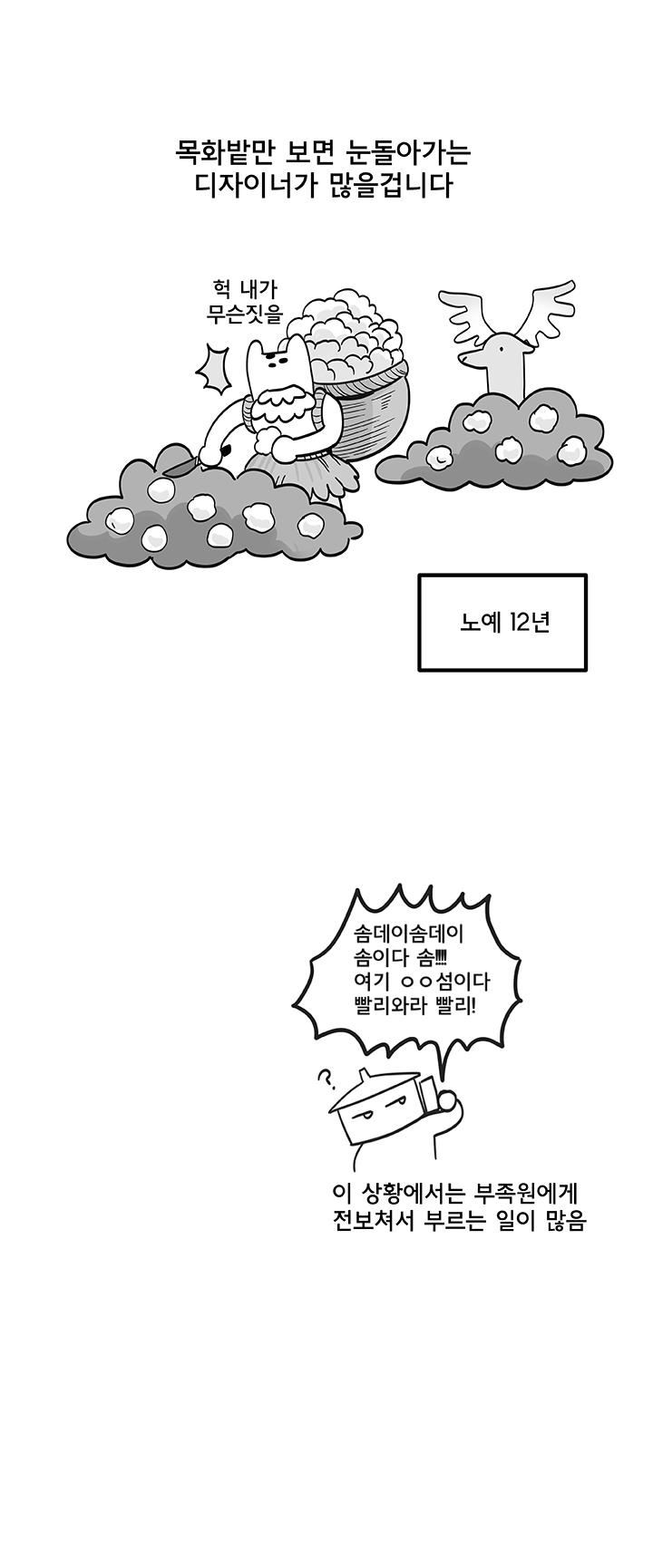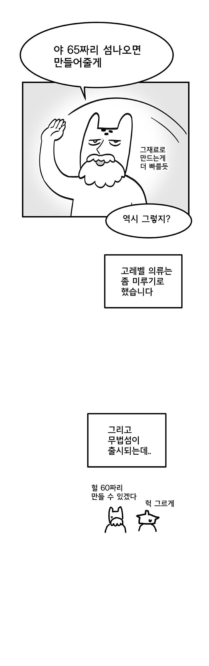 아래는 웹툰 작가 '국도'의 '듀랑고에서 살아남기 5화 - 의류직의 고충' 작품이다.