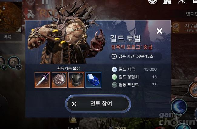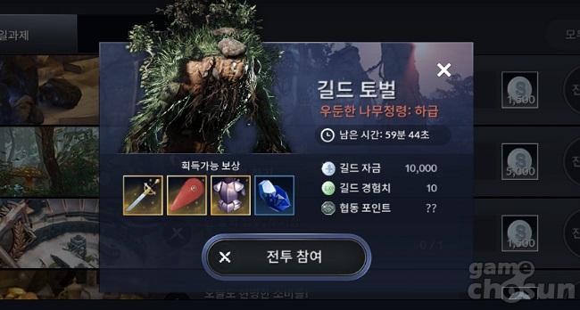 길드 대장 또는 부대장이 소환석을 통해 우두머리를 부르면, 각 길드원의 화면에는 길드 토벌에 입장할 수 있는 창이 팝업된다. 그리고 '전투 참여'를 누르면 입장 가능.