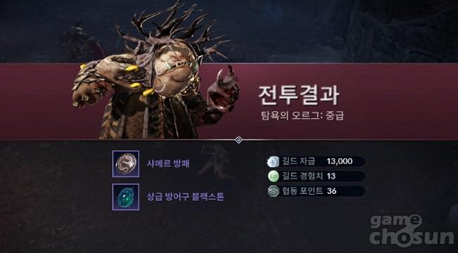 보상은 하급 난이도와 비슷했다. 유일 등급(보라색)인 샤메르 방패와 상급 방어구 블랙스톤을 획득했으며 길드 자금은 13,000, 길드 경험치 13, 협동 포인트 36을 얻었다. 길드 토벌에 참여한 인원이 많았다면 훨씬 수월하게 클리어 가능했을 것으로 보인다.