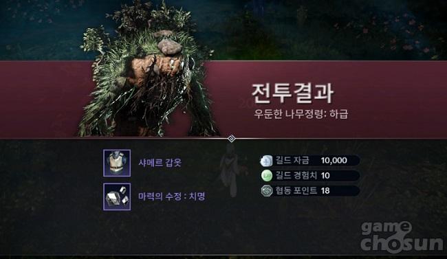 우선 하급 난이도에 도전했고 우둔한 나무정령이 등장했다. 길드원 6명이 참전했으며 별 어려움 없이 클리어 가능했다. 보상으로는 유일 등급(보라색)의 샤메르 갑옷과 마력의 수정: 치명을 얻을 수 있었다. 그 외 길드 자금 10,000과 길드 경험치 10, 협동 포인트 18은 덤이었다.