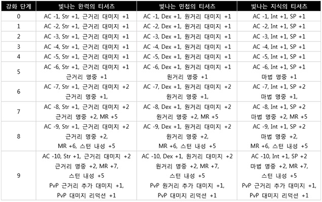 ◆ 빛나는 티셔츠 강화단계별 상세옵션