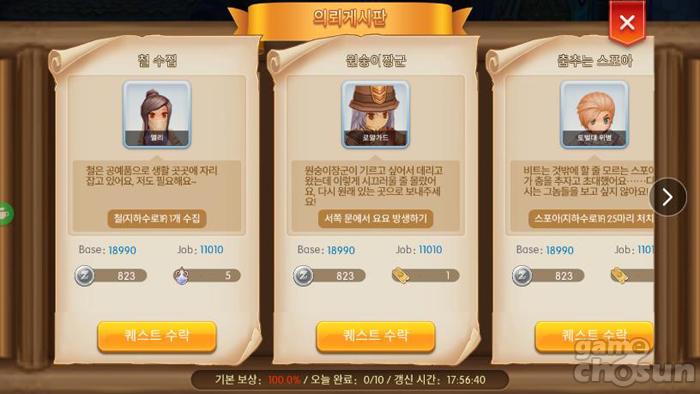 일일 퀘스트는 자신의 레벨에 맞춰 보정된 경험치를 주는데다 매우 간단한 의뢰이기 때문에 하루에 한번 초기화되기 전까지 무조건 수행해야 하는 코스다.
