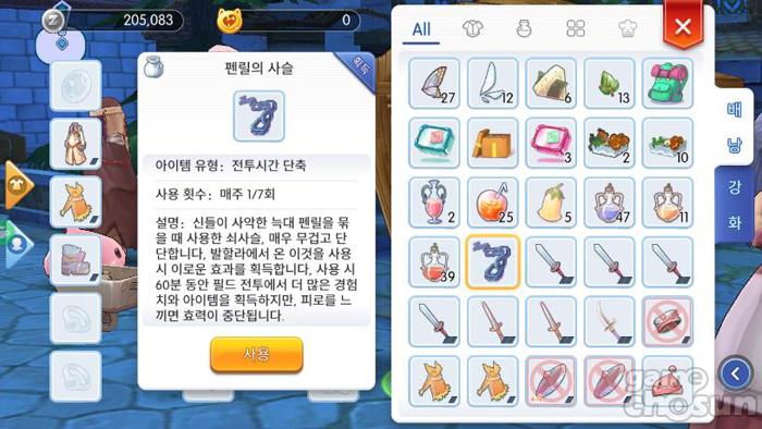 '펜릴의 사슬'은 시간이 부족한 이용자가 300분을 모두 사용하기 힘들거나, 보다 빠른 레벨업을 원하는 이용자에게 필요한 아이템이다. '펜릴의 사슬'을 사용하면 피로도가 2배 빨리 소모되는 대신 경험치도 2배 빠르게 얻을 수 있다.