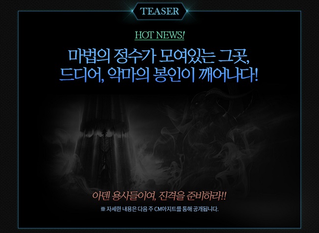 해당 예고는 '마법의 정수가 모여있는 그곳, 드디어, 악마의 봉인이 깨어나다!' 란 문구와 함께 탑 실루엣이 드러난 것이 전부지만, PC버전을 즐긴 유저들 사이에서 상아탑 업데이트와 데몬 등장을 암시하는 문구로 여기고 있는 상황.