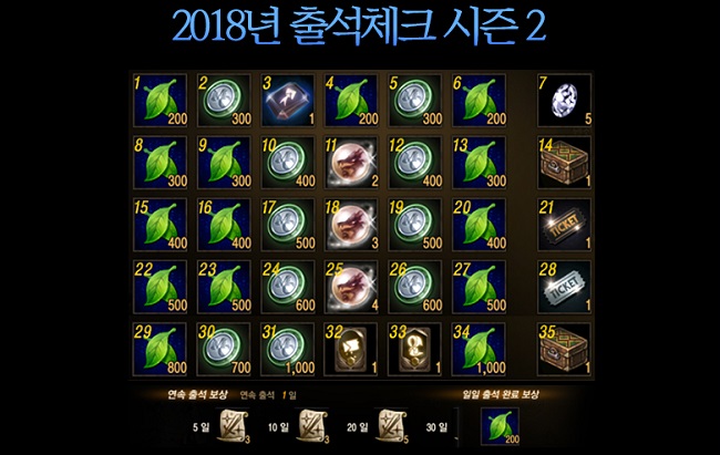 한편, 업데이트 이후부터 지난 달 한 차례 개편한 바 있는 출석체크 보상이 시즌2로 넘어간다. 시즌1 35일 누적 출성을 달성한 이용자들은 시즌2 준비 기간 동안 일일 완료 기본 보상인 '아인하사드의 축복 200'만을 얻을 수 있었으나 시즌2로 넘어가게 되면 다시 시작되는 누적 출석 보상을 얻을 수 있게 된다. 누적 출석 보상은 시즌1과 비교하여 크게 달라진 점은 없으나 각종 악세사리 상자 및 교환 티켓은 물론이고 35일 간 누적 출석 시 '봉인된 희귀 아이템 제작 비법서 상자'의 기회가 새롭게 주어지게 된다.