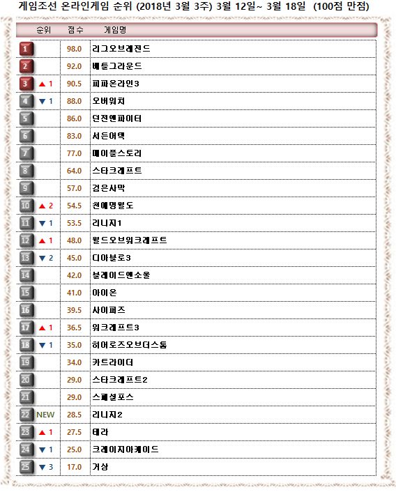 ▲2018년 3월 3주 온라인게임순위 (게임조선 제작)