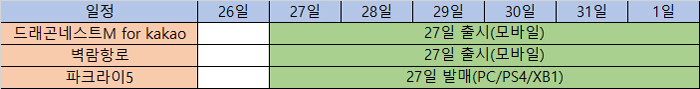PC 온라인게임인 ‘드래곤네스트’를 기반으로 한 모바일게임 ‘드래곤네스트M for kakao’가 27일 국내 출시될 예정이며, ‘소녀전선’, ‘붕괴3rd’을 국내 출시한 X.D 글로벌이 일본에서 인기를 모은바 있는 ‘벽람항로’를 서비스한다.