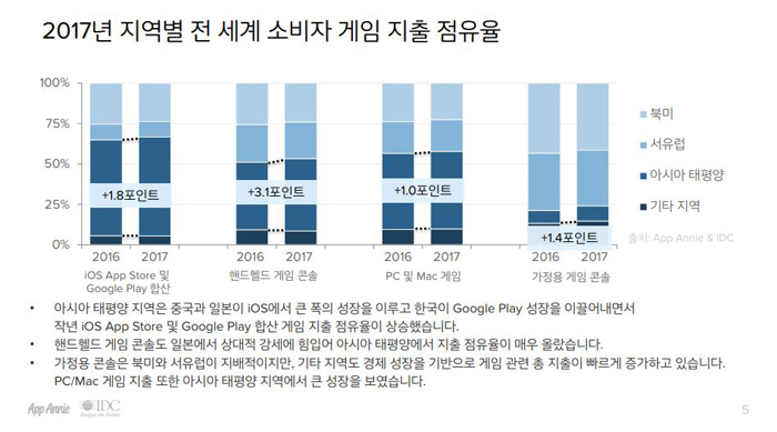지역별 전 세계 소비자 게임 지출 점유율의 아시아 태평양 지역을 살펴보면 대부분의 플랫폼에서 지출 점유율이 상승한 것으로 조사됐다. 이 중 모바일게임은 중국와 일본이 애플 앱스토어, 한국이 구글 플레이에서 성장이 이뤄졌다.