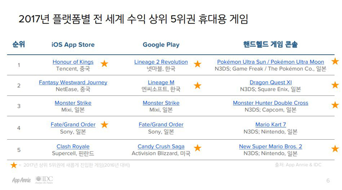 앱애니와 IDC(International Data Corporation)은 2017년 게임트렌드와 동향을 조사한 2017 게임스포트라이트 리뷰를 발표했다.