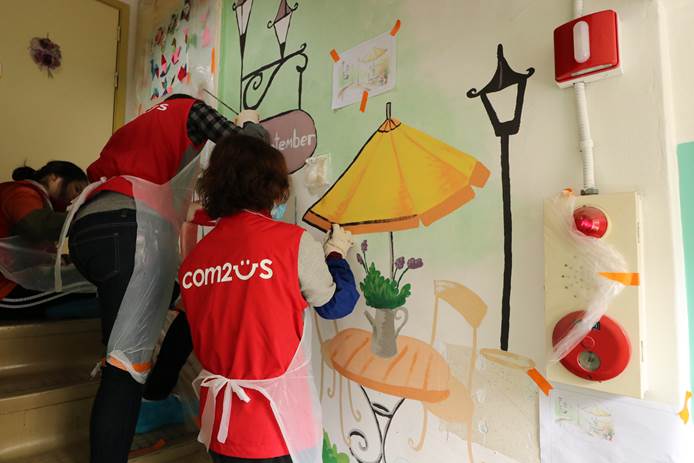 컴투스 사내 봉사단 '컴투게더' 단원들은 오전부터 이번 봉사활동에 참여했고 리모델링 작업 및 벽화 그리기에 필요한 제반 비용과 함께 냉장고 등 필요 물품 전액을 후원했다.