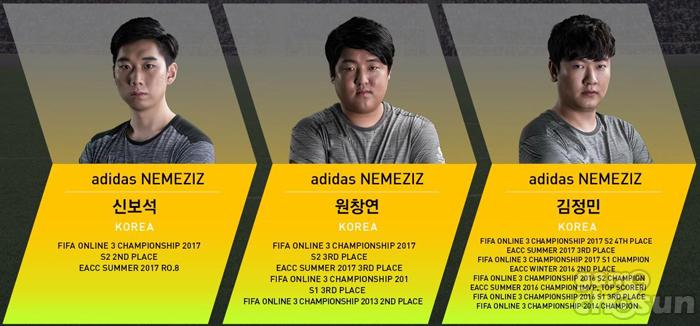 ‘Team Adidas NEMEZIZ’는 ‘피파온라인3 아디다스 챔피언십 2017 시즌2' 2~4위를 차지한 신보석, 원창연, 김정민 선수로 구성됐다. 상대 움직임과 패스 흐름을 간파하는 센스, 수비력 등이 장점인 신보석 선수는 특유의 수비력을 앞세운 점유율 축구를 선보인다는 계획이다.